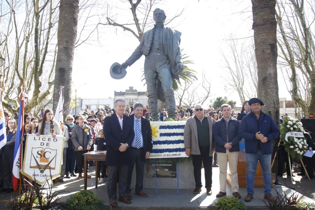 El intendente Abella colocó la ofrenda floral al pie del monumento a José Gervasio Artigas acompañado por los diputados de todos los partidos del departamento, Diego Echeverría, Federico Casaretto, Gabriel Gurméndez y Joaquín Garlo.