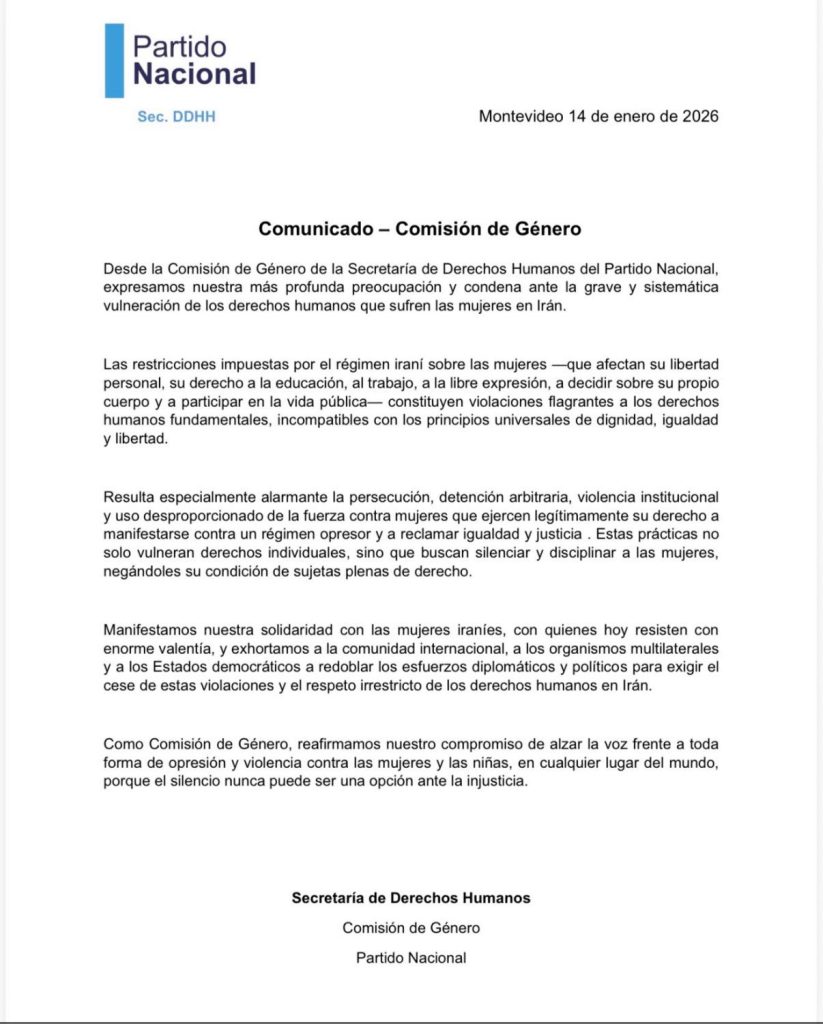 El comunicado del Partido Nacional expresa solidaridad con las mujeres iraníes y exhorta a la comunidad internacional, a los organismos multilaterales y a los Estados democráticos a redoblar esfuerzos diplomáticos y políticos para exigir el cese de las violaciones a los derechos humanos en ese país.